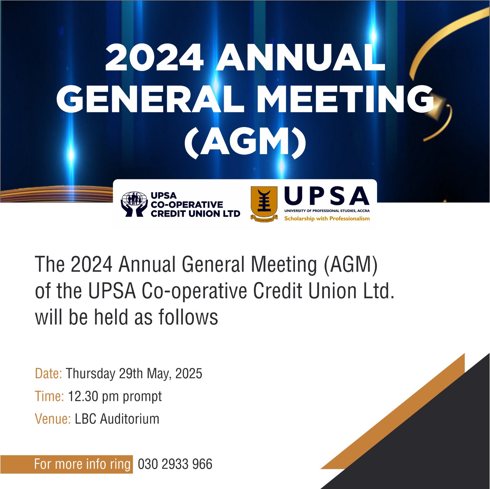 The 2024 Annual General Meeting (AGM) of the UPSA Co-operative Credit Union will be held as follows: